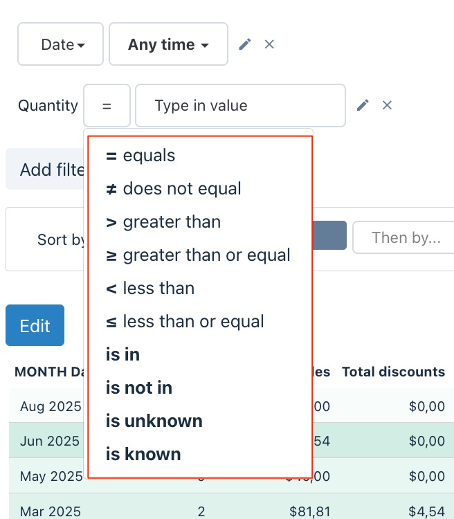 Numeric fields don’t have implicit filters in Better Reports — you’ll always need to add your own. These filters let you narrow results to rows that match, exceed, fall below, or are missing numeric values.