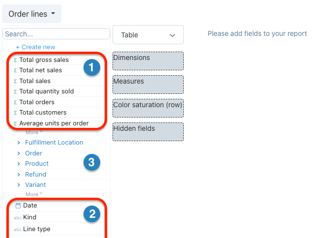 In the available fields pane, measures appear at the top (1), prefixed with the ∑ icon. Below them is the related tables section (3), followed by dimensions (2).