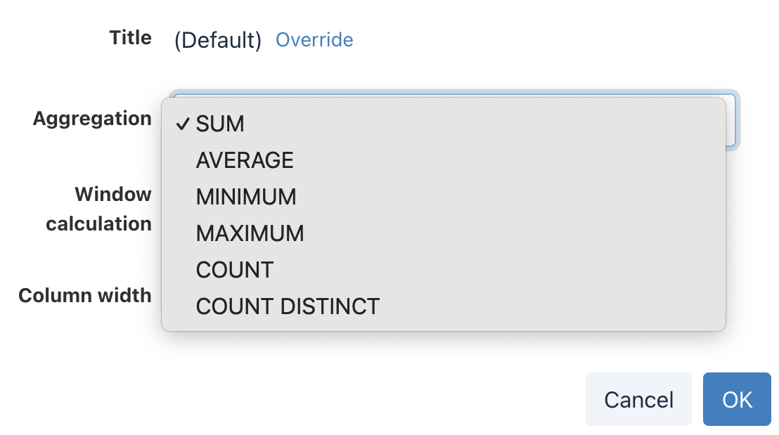In these cases, you can apply aggregation functions such as COUNT, SUM, AVG, MIN, or MAX to return one value for each line in the report.