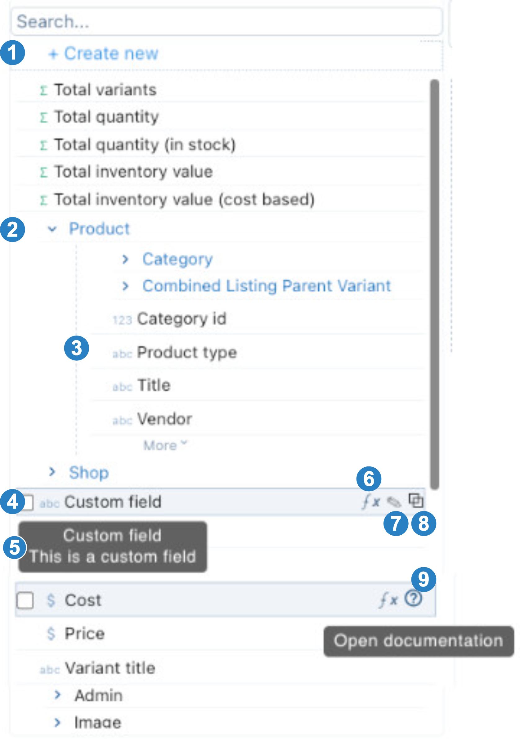 Select the Edit icon (7) to update a custom field formula, or select the Copy icon (8) to duplicate a field. Select the API reference icon (9) to view the field definition in the Shopify API documentation. This feature is not yet available for other connectors.