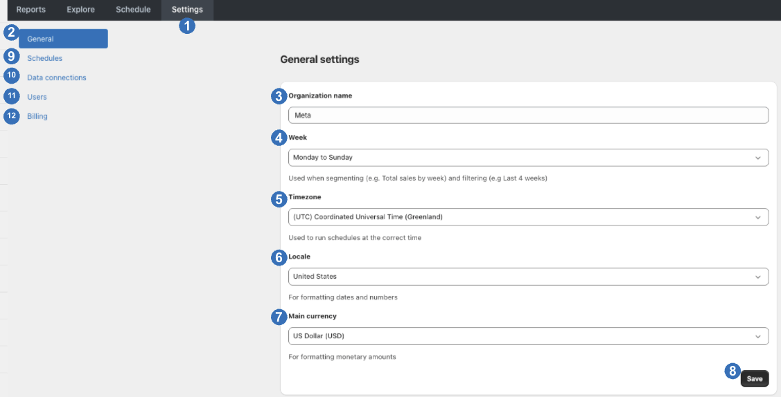 In the General section (2), you can manage settings that affect how data is grouped, displayed, and scheduled across your reports.